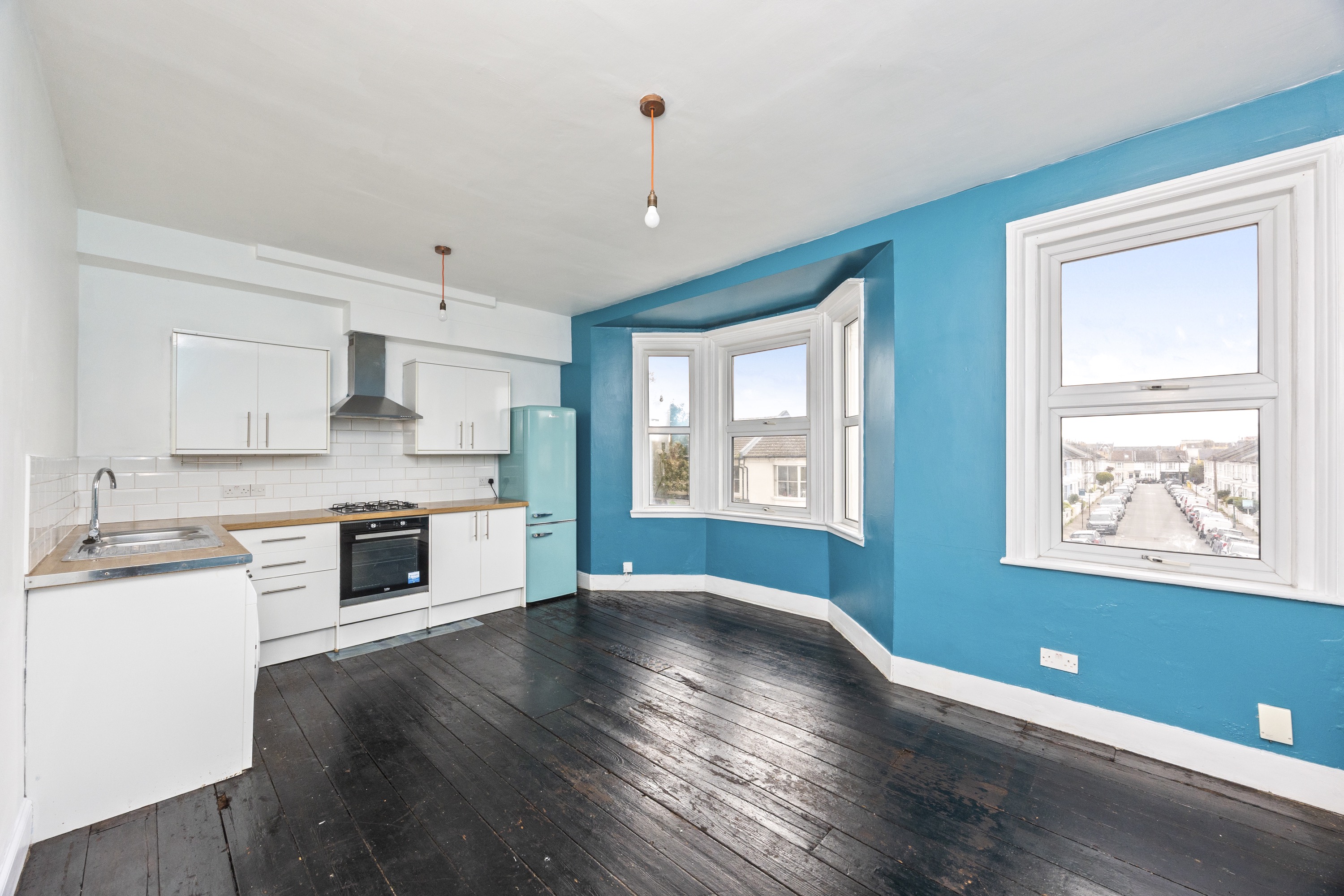 The property is accessed via its own street entrance and comprises on the first floor a south facing bay fronted open plan lounge/kitchen, two double bedrooms and a bathroom with shower over the bath, on the second floor is the master bedroom with en-suite shower room.